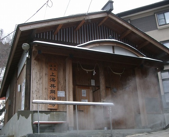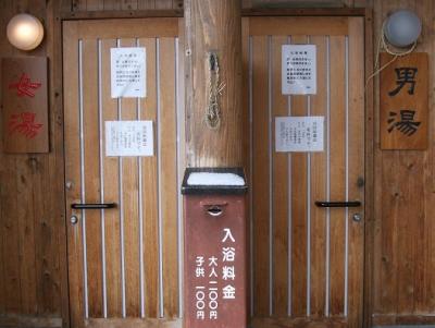 山交泉バスターミナルから高湯通りを上っていくと、途中に下の湯共同浴場があって、そしてほぼ突き当たりに上湯共同浴場があります。どちらも無人で、入口の箱に自分で200円入れて入浴します。近隣の旅館やホテルに宿泊すると、無料で入れます。