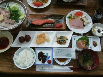 朝食も、シャケ、タラコ、シラスおろし、カスピ海ヨーグルトなど、ほっとするメニューの和食膳に、豚肉陶板焼きもあって、ボリュームもありました。