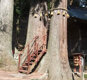 境内には樹齢800年の『子宝の杉(夫婦杉)』があって、根が1つなのに幹が2つに分かれています。願をかけながら渡れるように階段で渡れるようになっています。