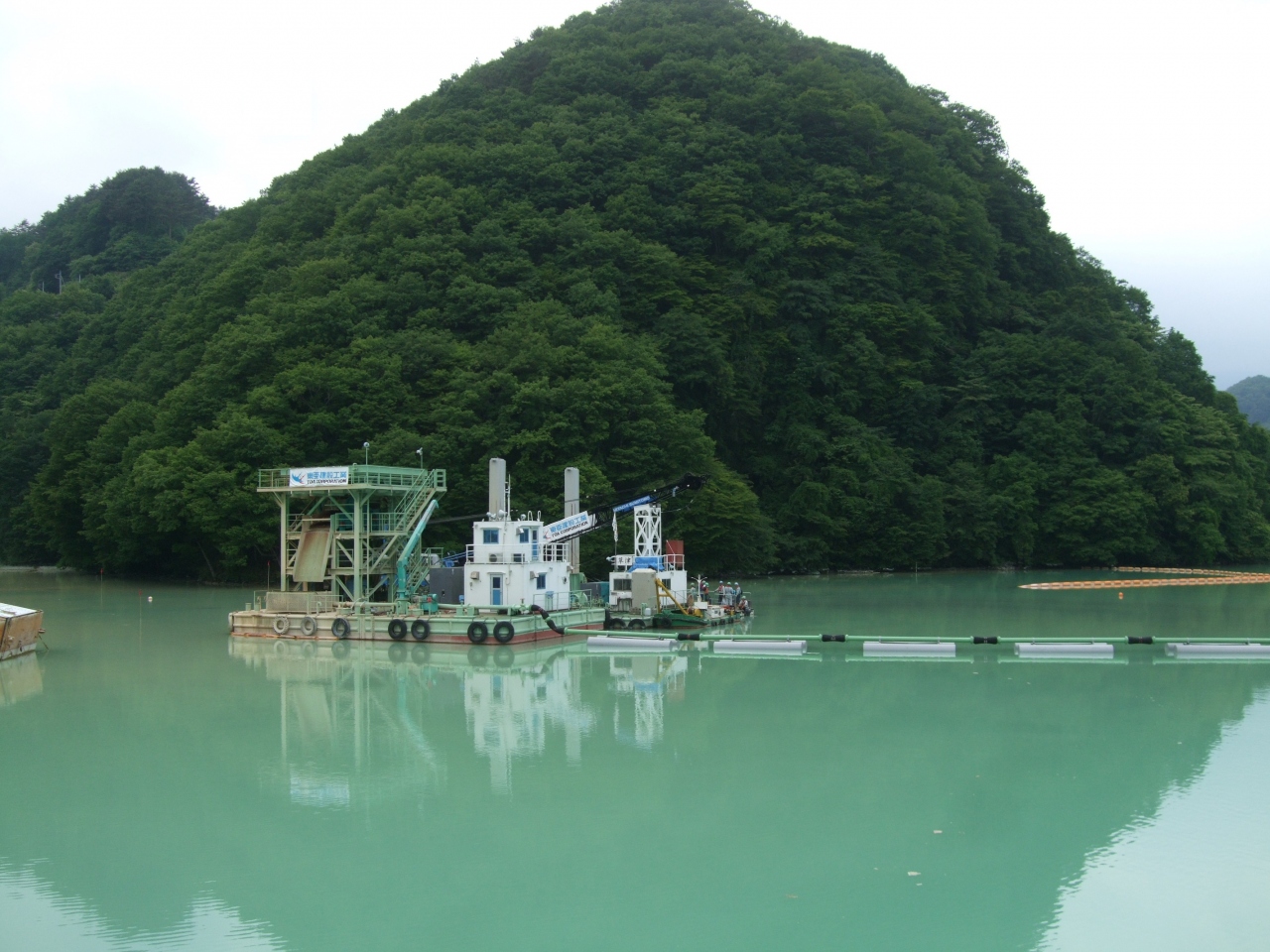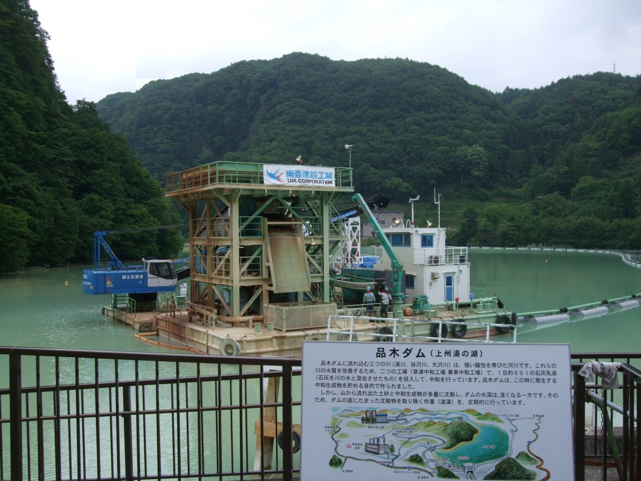 品木ダムに流れる3つの川(湯川、矢沢川、大沢川)は強酸性の河川で、魚も棲めません。それを中和させるために石灰乳液を投入して、沈殿物を取り除くためにダムを設置されています。