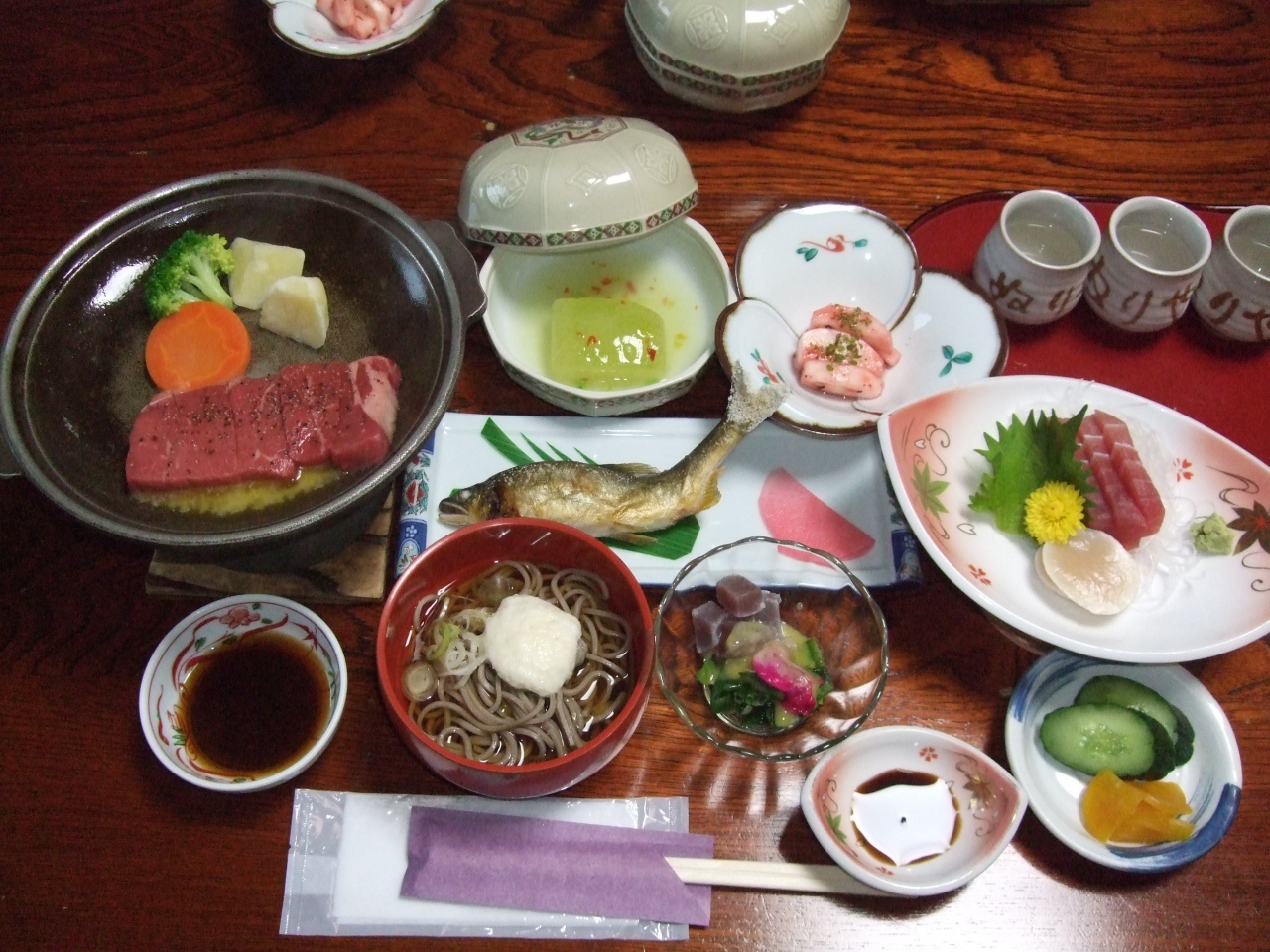 食事は、地元の山の食材を中心に丁寧に調理されていて、各種山菜、自家製ソバ、鯉のアライなど、土地の季節を味わえる料理です。