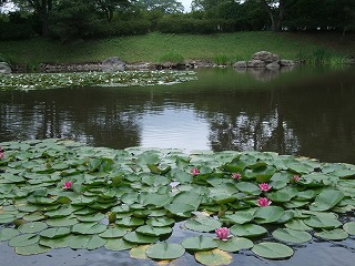 里山の自然林を残しながら、憩いの場となるように、丁寧に整備されています。広い敷地には、里山林、芝生の広場、東屋、遊歩道、池もあります。アジサイやベコニア、池には白や赤い連の花が咲いていました。