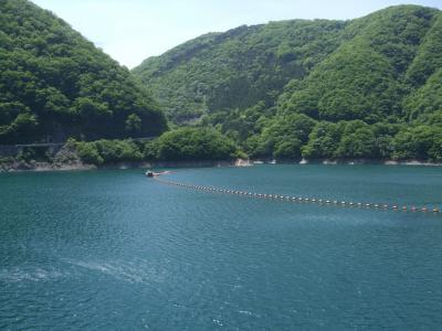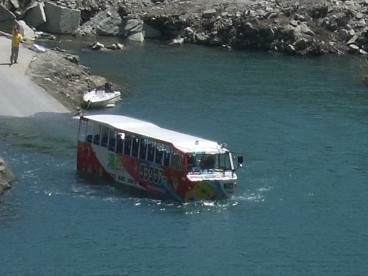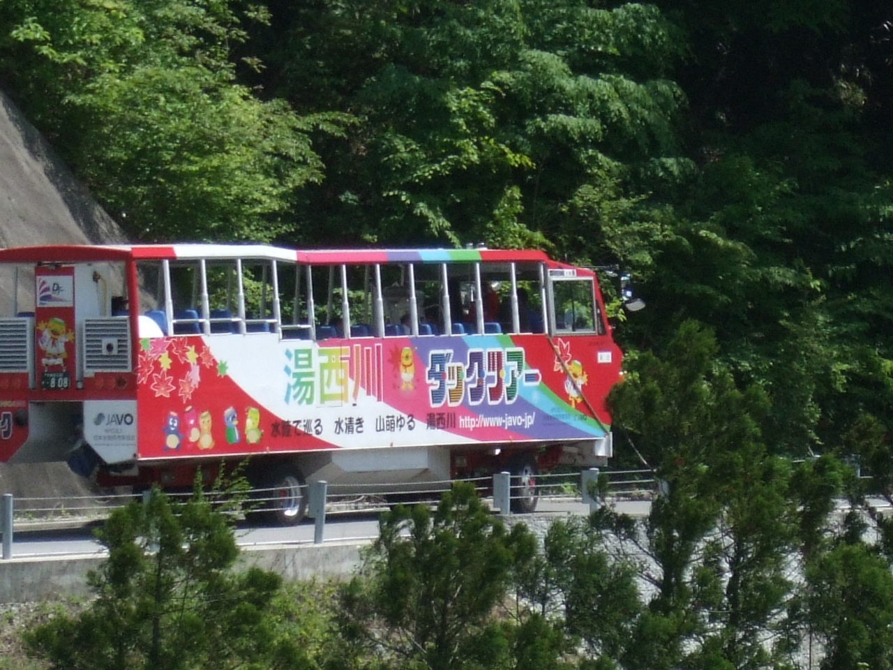 ひとつは、初めに水陸両用バスで陸地の走行と湯西川湖へのスプラッシュ、クルーズ体験をして、その後通常のバスに乗り換えて湯西川ダムの見学を行うツァーです。