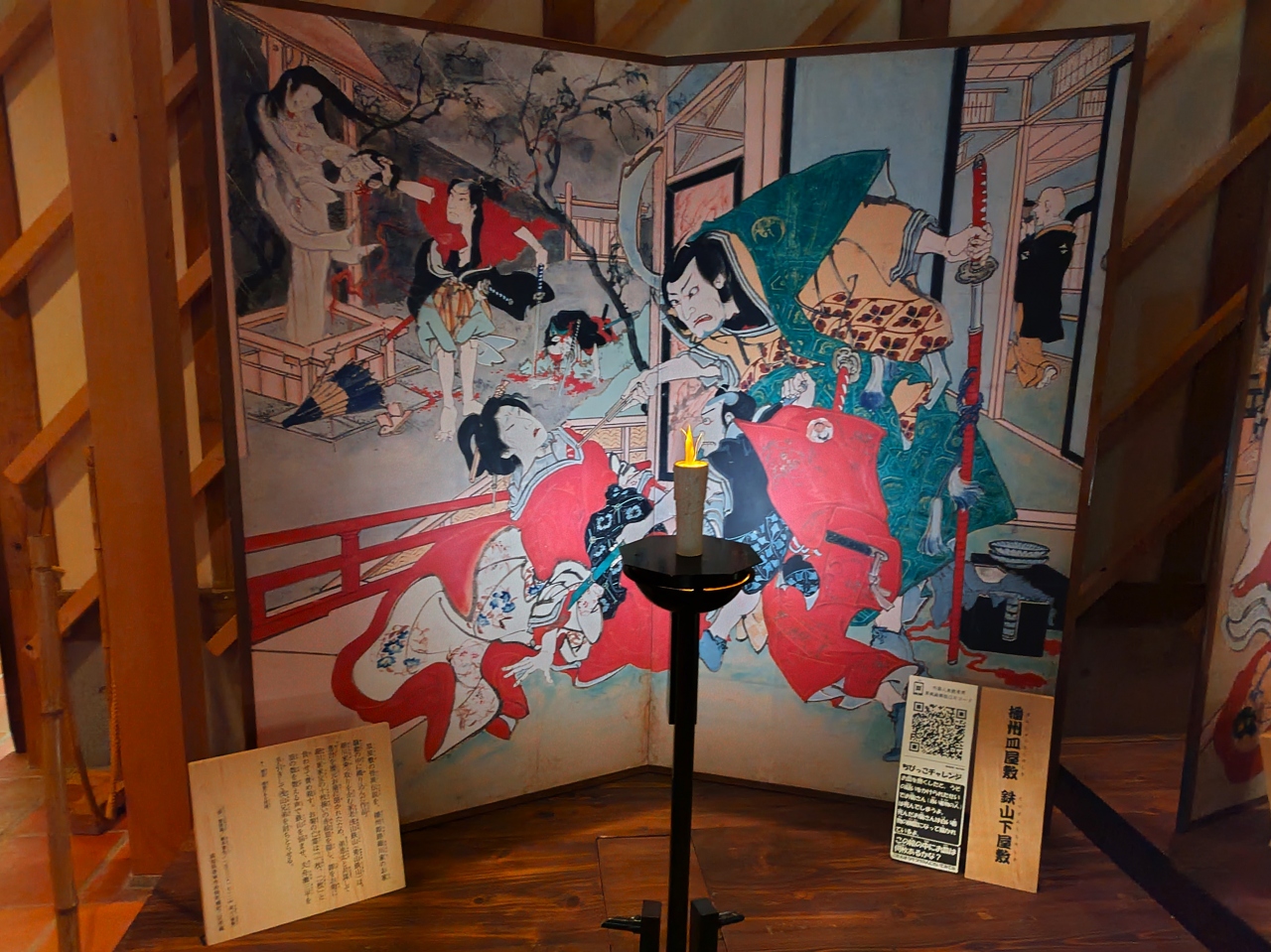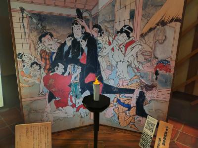 入口で提灯を渡されて、暗闇の中で提灯のろうそくの灯りで芝居絵屏風を見ると一層圧倒されます。全てレプリカですがおどろおどろしさが伝わってきます。