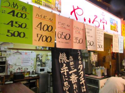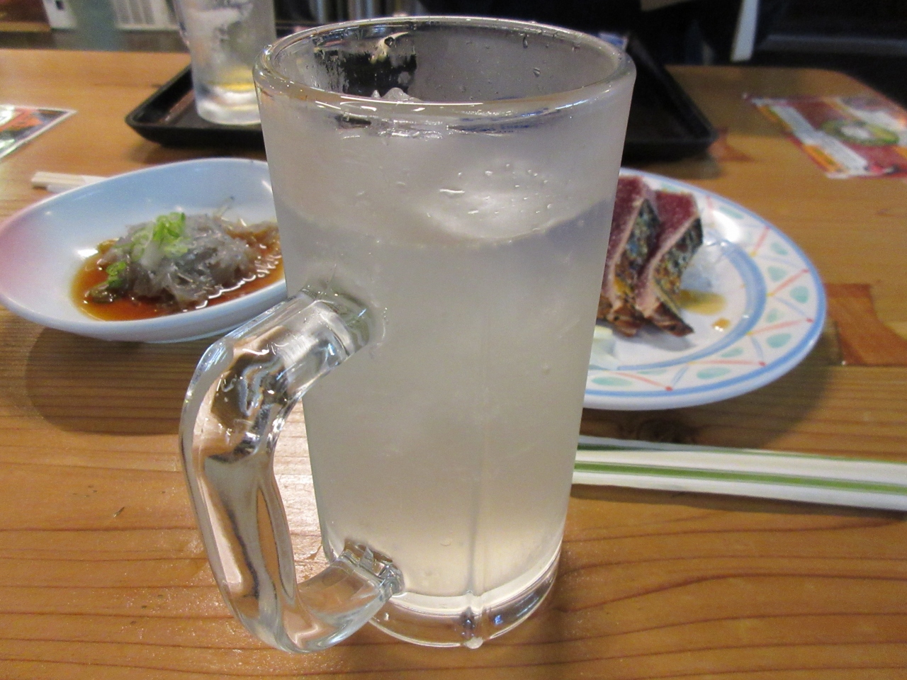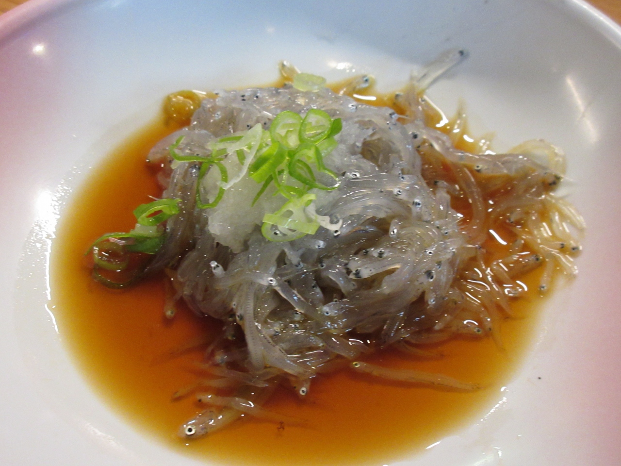 最初に、どこか空席を見つけて席の確保をしてから、いつも混んでいるやいろ亭で「塩たたき」と「ゆずサワー」を注文します。今回は「どろめ」(生しらす)を発見!これもいただきました。
