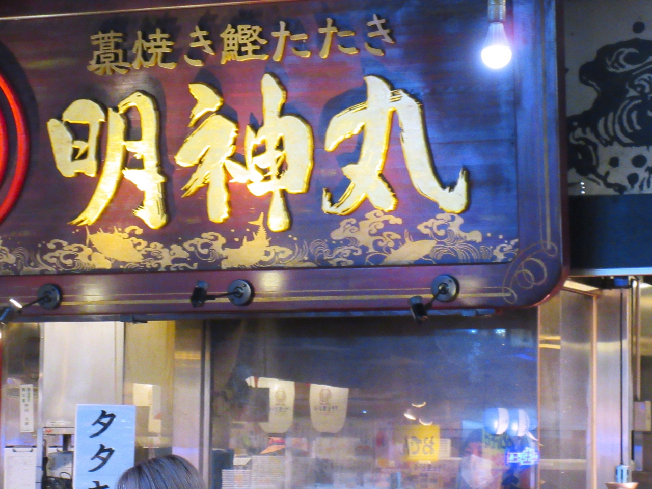 明神丸といえば、「わら焼きかつおのタタキ」が有名で、ガラス越しにわら焼きの実演が見られます。その前に行列ができています。