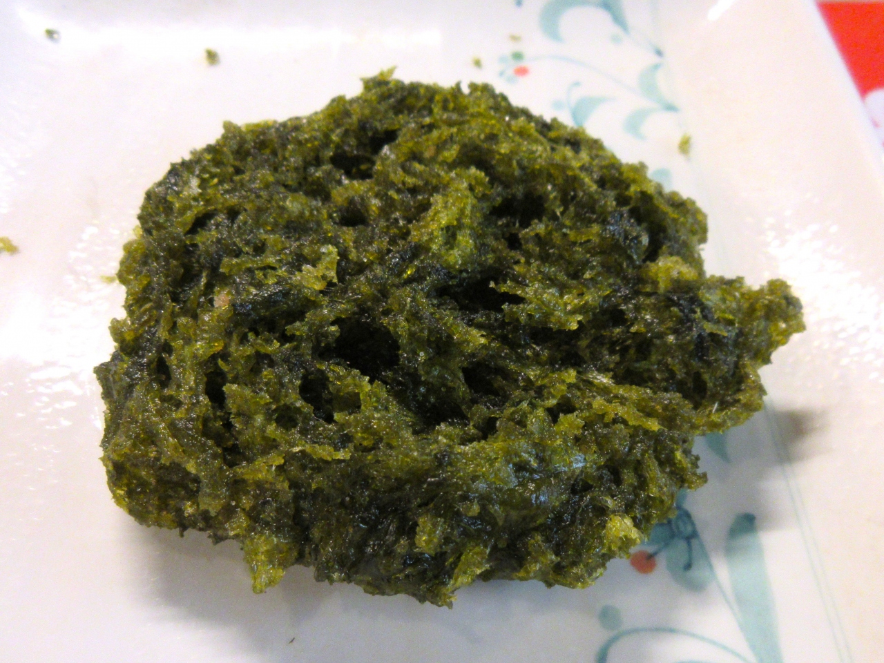 今回は意表をついて、明神丸の「青さのりの天ぷら」をいただきました。天ぷらにすることで、口に含んだ時に青さの香りが強くなります。とても美味しいです。