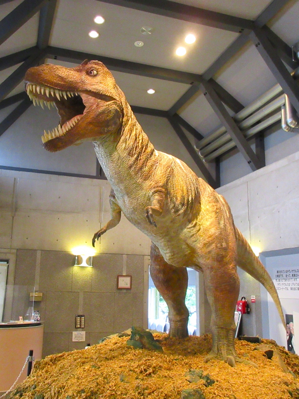 地質館といえば、たかが化石と骨格標本くらいだろう、と思って入ったら、狭いエントランスホールにいきなり大きな恐竜チラノサウルスが動いてこちらを向いてビックリしました!声も出ます!