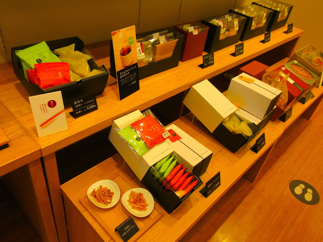 伝統的な芋けんぴやポテトチップスタイプの『芋チップ』もあります。試食もあります。