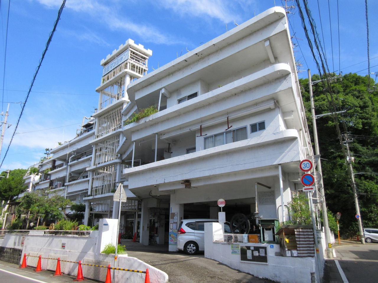 玄関側から見ると、大型客船のようにも見えます。増築に増築を重ねた外観から、「軍艦島」「日本の九龍城」とも呼ばれることがあるのも頷けます。