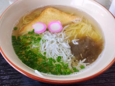 このお店のスープは、ちりめんを釜揚げする時のゆで汁やかつおのきいた和風出汁の少し甘めでさっぱりしたスープだそうです。それにに中華麺が入って、ちりめんじゃこ、ねぎ、とろろこんぶ、すまき、すりみ天が乗っています。