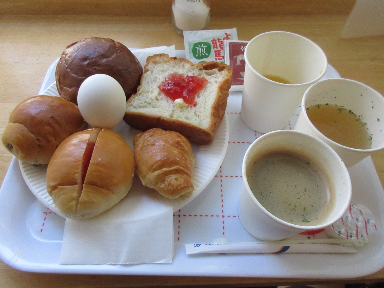 「朝食サービス」と言っている朝食の内容は、クロワッサン、バターロール、レーズンバターロールなど、6種類のパンと、ゆで卵、コーヒー、紅茶、コーンポタージュ、チキンスープ、フルーツジュースなど、10種類くらいのドリンクが飲み放題という程度。でも連日の朝食ならばこれくらいで満足です。- 旅行時期