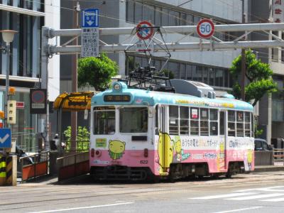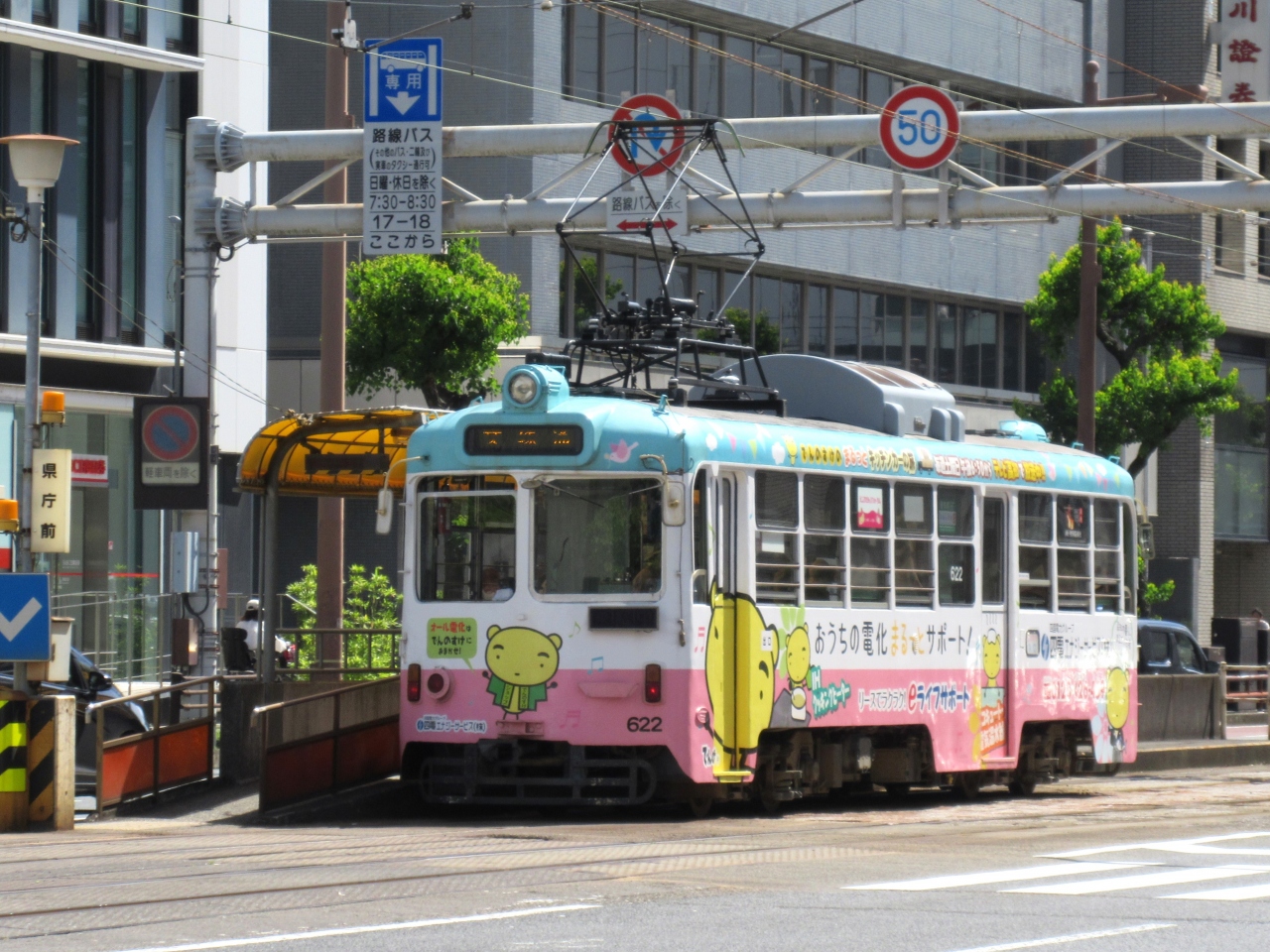 県庁前停留場で見かけた600形 622号車は「四電エナジーサービス」のラッピングでした。