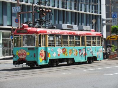 街中で走行中の「アンパンマン電車」に遭遇したのは、600形 612号車は「アンパンマン、anpanman museum、香北町」のラッピングでした。