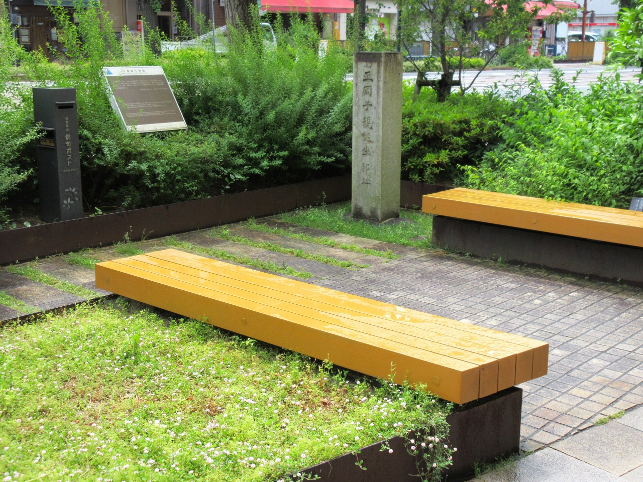 車の多いメインストリート沿いですが、植物に囲まれたベンチもあって、落ち着ける一角になっています