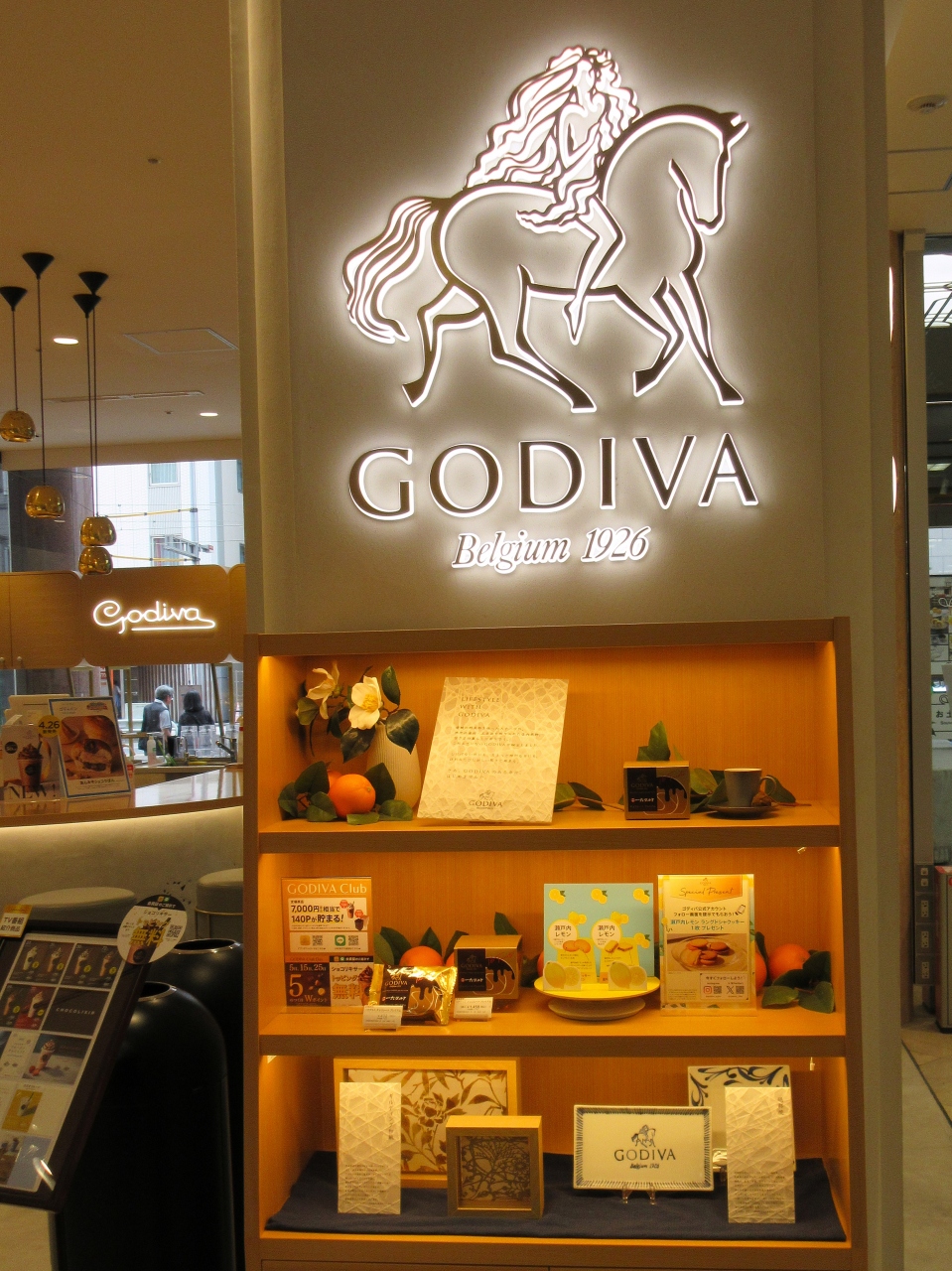 例えば1階の「十五万石YUI」は、愛媛の特産品、今治タオルや砥部焼から、全国各地のものもある大きなお土産店です。でもここのお店には、GODIVAの戸コラボ商品も多数あって、人気のゴディパンもあるし、一六タルトや瀬戸内レモンラングドゥシャや砥部焼砥のコラボ商品もあります。さすが三越内の店舗だと感心しました。