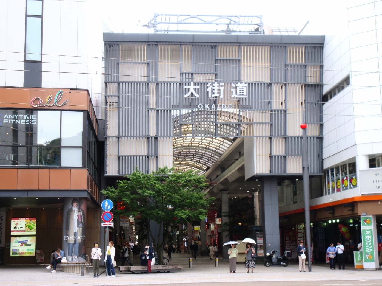 南には大街道、銀天街、松山市駅へ通じていて、北には松山城のロープウェイ乗場へ通じる松山ロープウェー商店街が伸びています