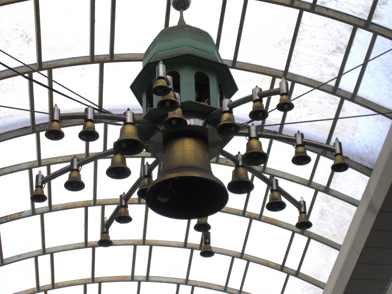 今回発見したのは、大街道のカリヨン「フライブルクの鐘」です。松山市と姉妹都市のドイツ・フライブルク市の市役所の鐘をモチーフに制作されたそうです。中央の大きな鐘が時を打って、24個の鐘によるクラシックからポップスまで55曲のレパートリーがあるそうです。