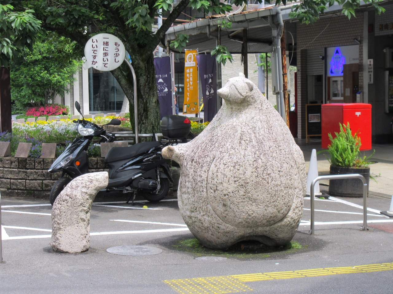 銀天街と大街道南端との間で千舟町通りを横切るのですが、巨大な石造りの「狸モニュメント」がありました。愛媛県にある『伊予八百八狸』というたぬき伝説と、札幌の狸小路商店街と松山の商店街が姉妹縁組を結んだ記念に設置したそうです。