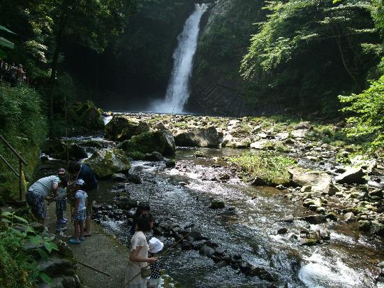 滝の高さは25m、幅7mくらいですが、水量があって水しぶきもかかるので、迫力を感じます。周りに多くの樹木があって日陰も出来るので、真夏でも天然のエアコンになっています。国道のおみやげ店の気温と、滝の付近とでは10℃くらいの差があります。