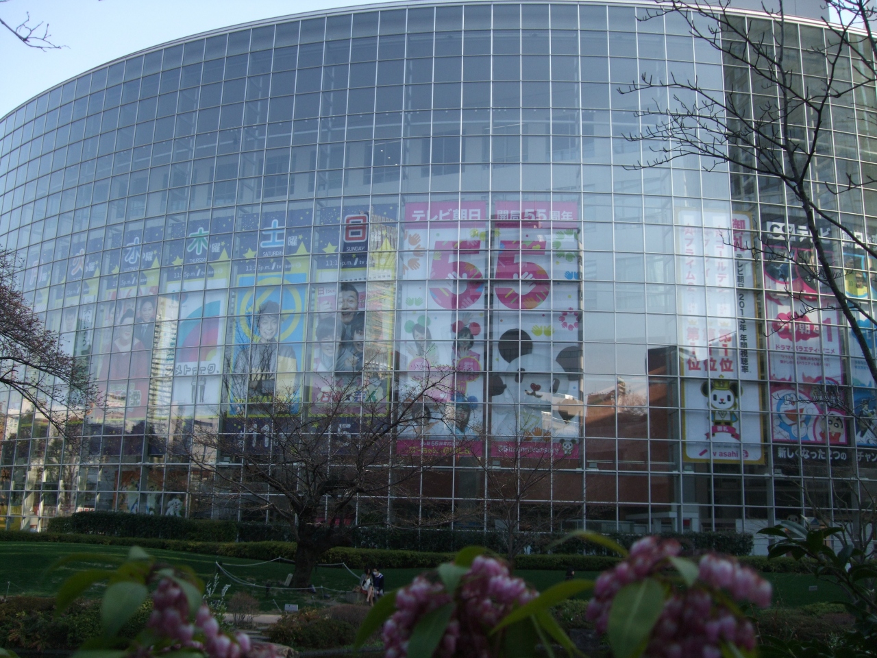テレビ朝日本社の内部には入れませんが、下から上までの吹き抜け部分が総ガラス張りになっている、1階の「アトリウム」には誰でも入れます。各種番組の展示や、ドラえもんのタイムカプセルもあって、記念写真を撮るのに面白いです。