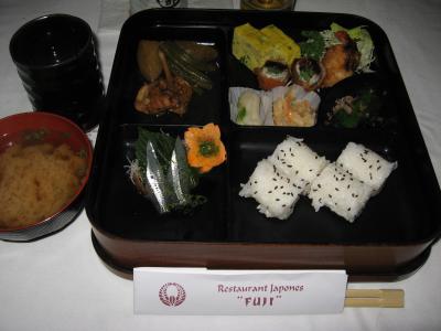 松花堂弁当を食べました。天ぷらはキスの代わりに、ペルーで入手できるペヘレイという淡水魚で、サヨリかキスの味に似ています。お米はカリフォルニア米で、日本米に近い味と食感です。大根の煮付け、白菜の漬け物、味噌汁など、日本人がホッとする物ばかりでした。