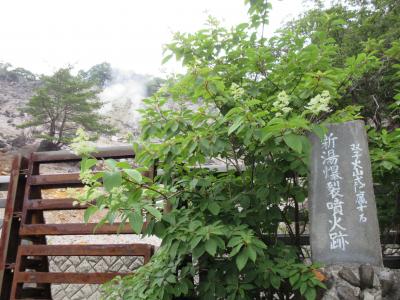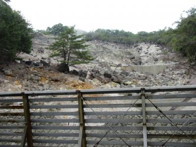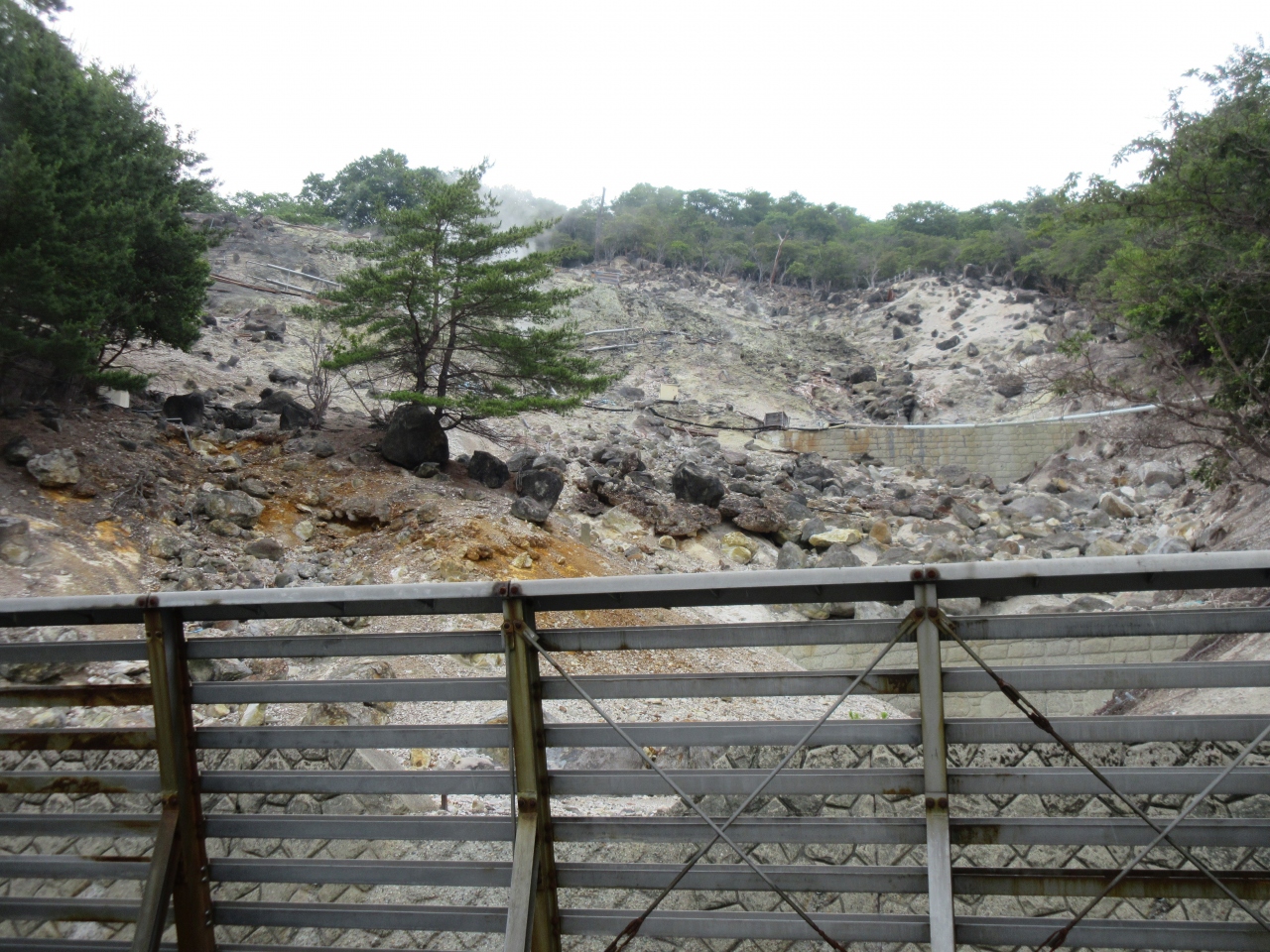 新湯爆裂噴火口跡」からは今でも湯けむりが出て、硫黄臭が漂っています。