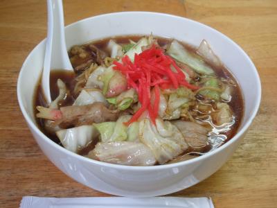 『スープ入り焼きそば』は、ざく切りのキャベツがたくさん入っていて、豚肉、ナルトの千切り、刻み紅ショウガがたっぷり入っています。スープは醤油ラーメンのスープの味で、焼そばのソースの味はあまり感じられなかったです。