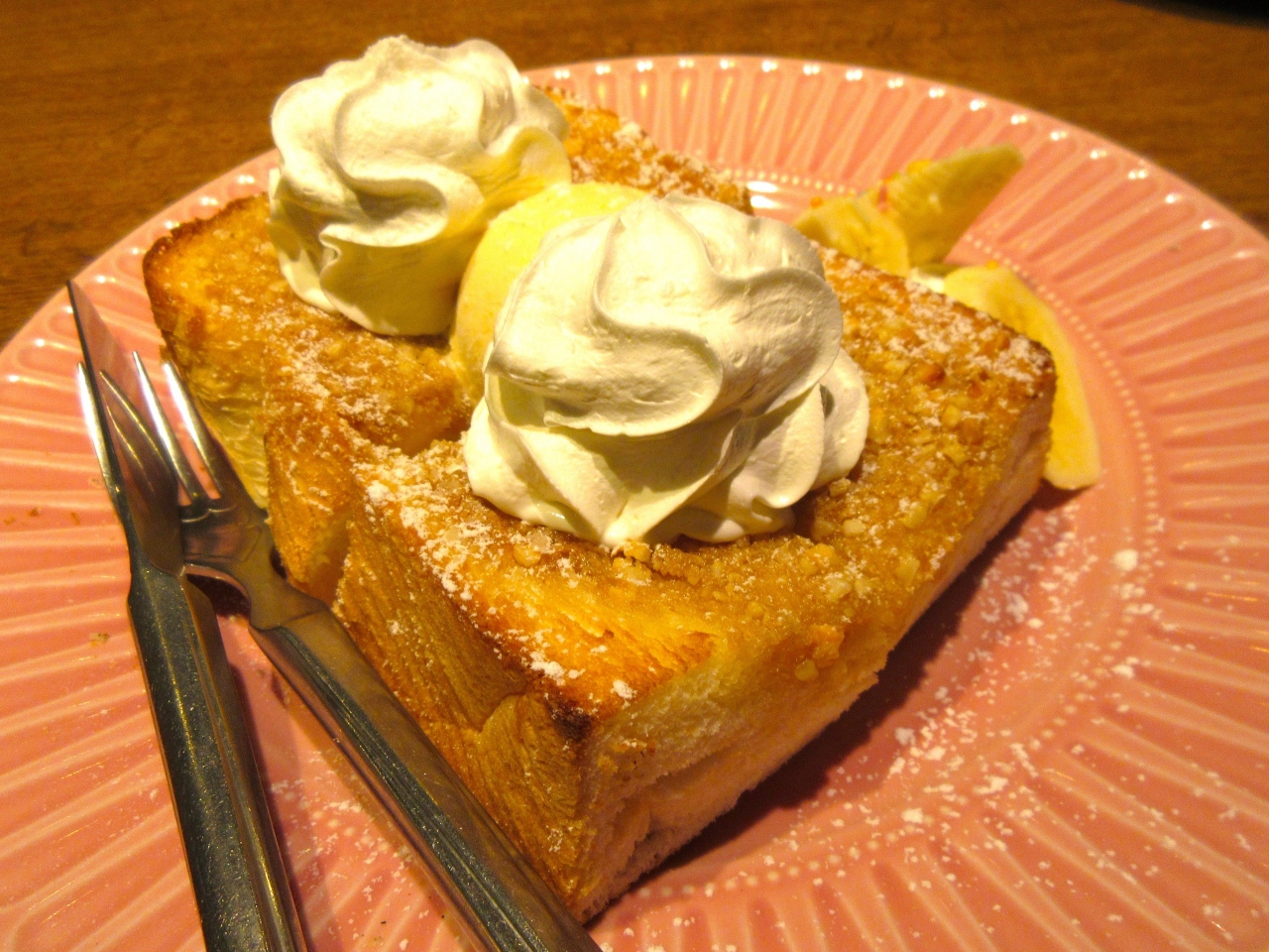『アーモンドバニラトースト』(968円)は、厚切りトーストに甘くて香ばしいアーモンドバターが塗られていて、ホイップクリームとバニラアイスが乗っています。