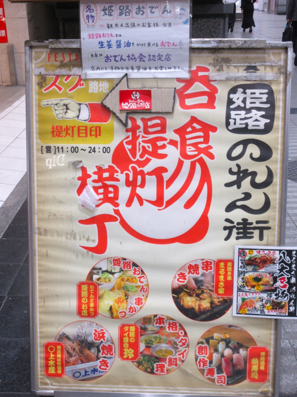 現在は全長650mのアーケード街で、飲食店が多いです。駅前なのにディープな店も多く、みゆき通りの途中から脇に入る呑み屋横丁、姫路のれん街には、串焼き、姫路おでん、創作寿司、タイ料理、浜焼きの店が並んでいます。- 旅行時期