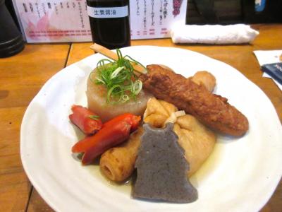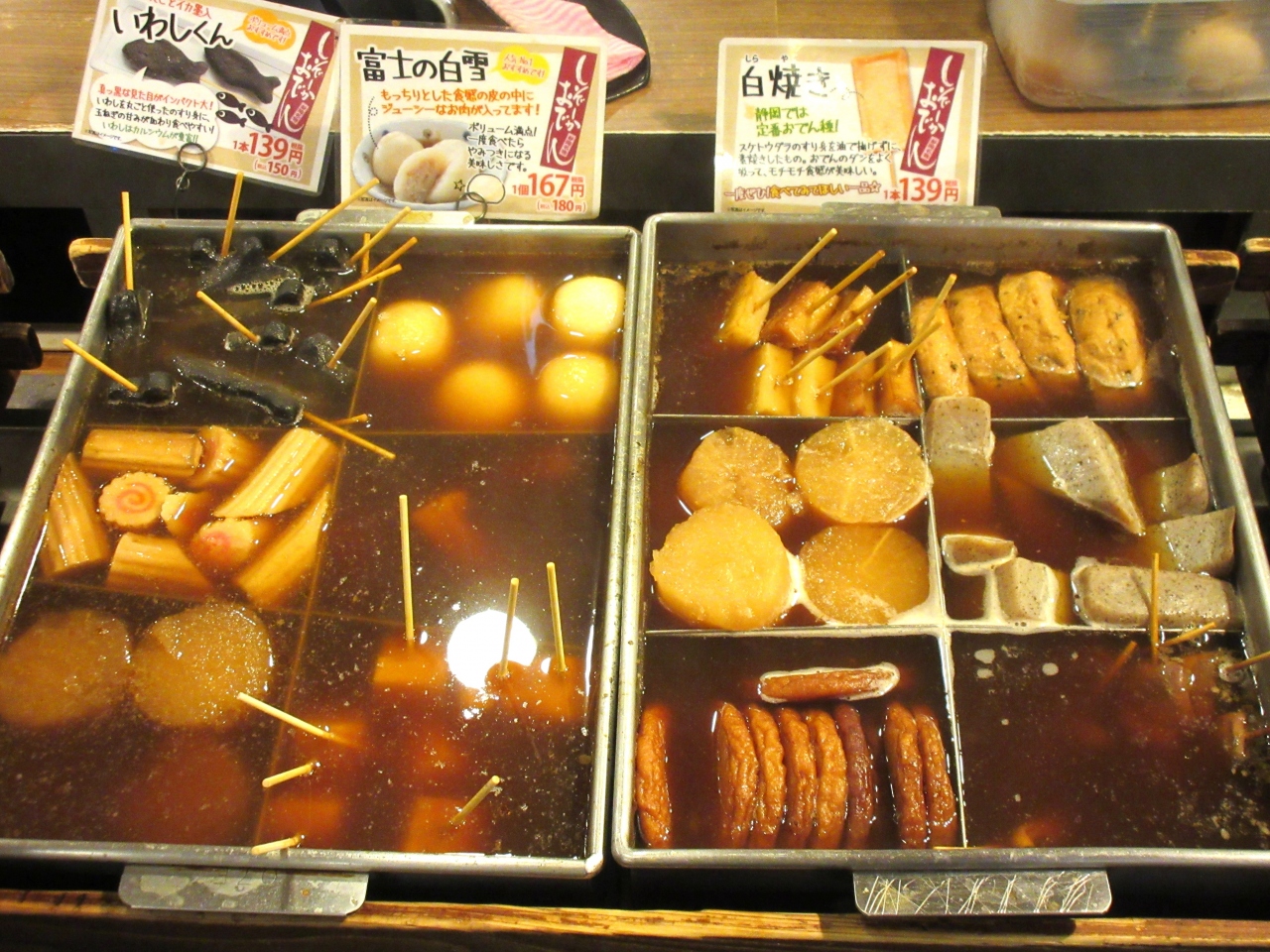 静岡名物の『しずおかおでん』もありました。汁を毎日つぎ足して茶黒くなった汁で良く滲みたおでんに、だし粉をかけるのが特徴です。- 旅行時期