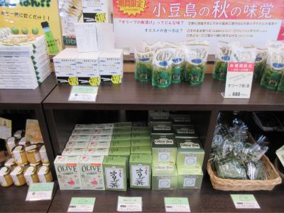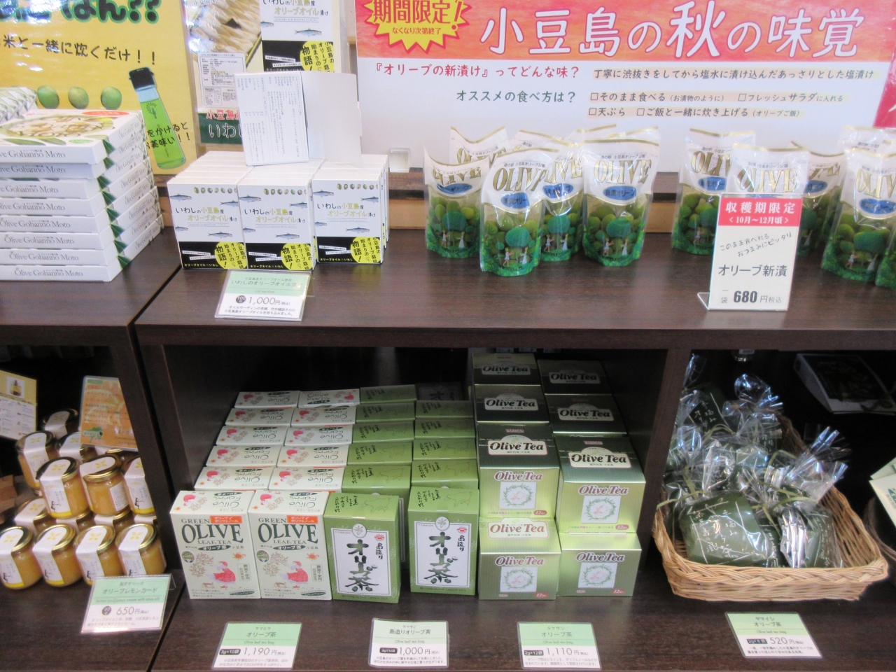館内には、オリーブに関する展示もあるし、オリーブを使った様々な商品がそろっています。オリーブそうめん、オリーブサブレ、オリーブリップクリームなど、ここならではのものがたくさんあります。