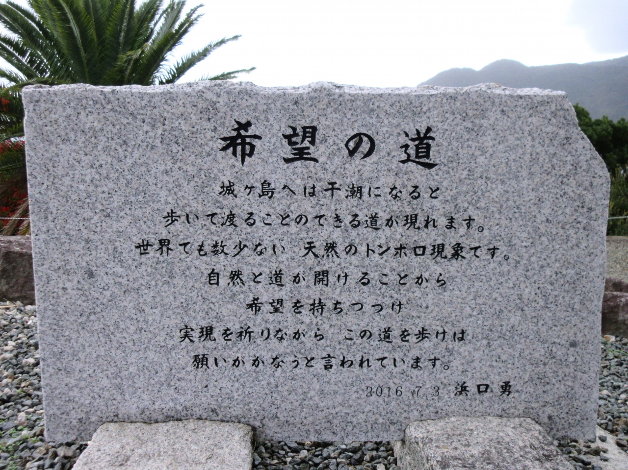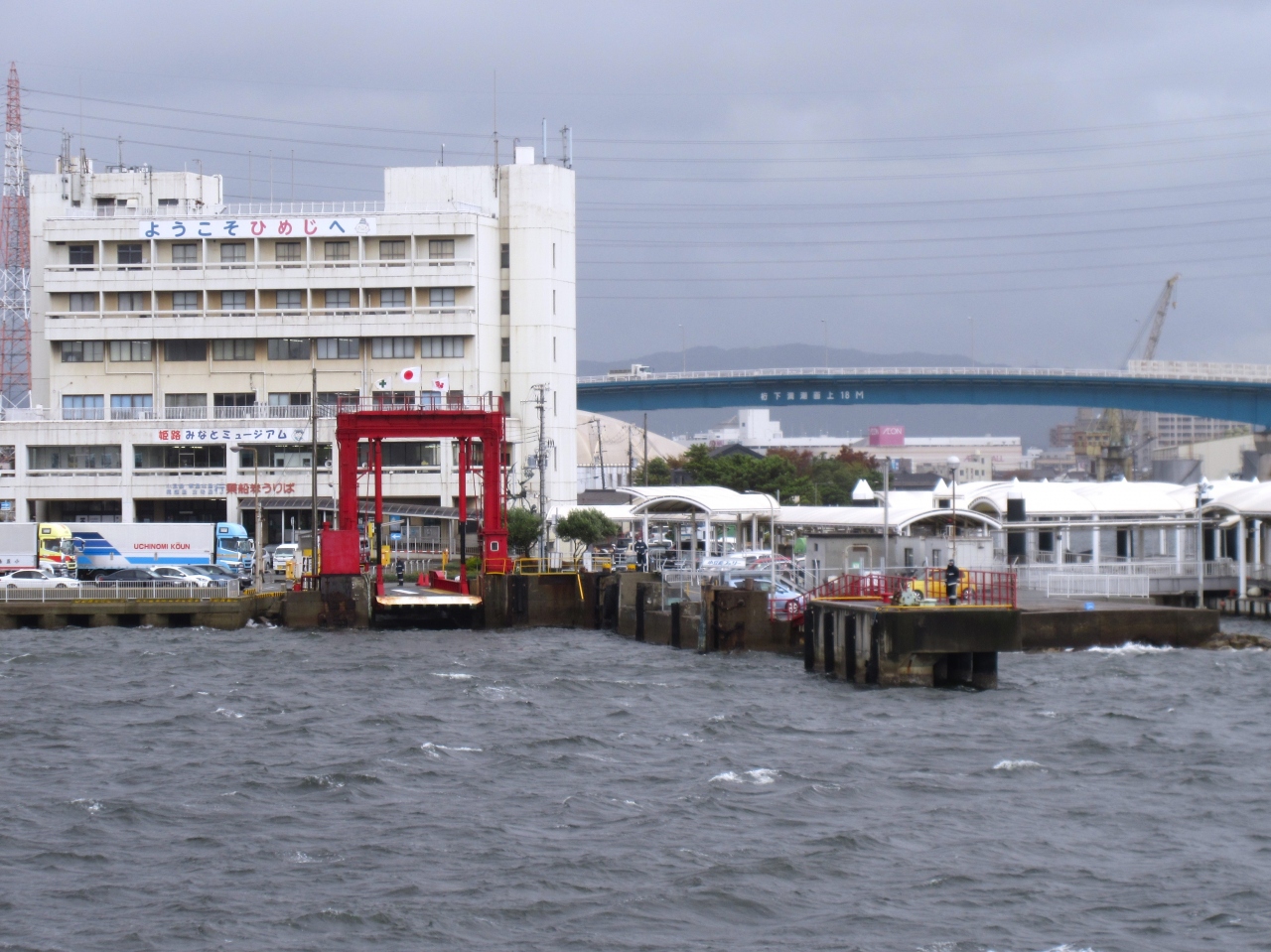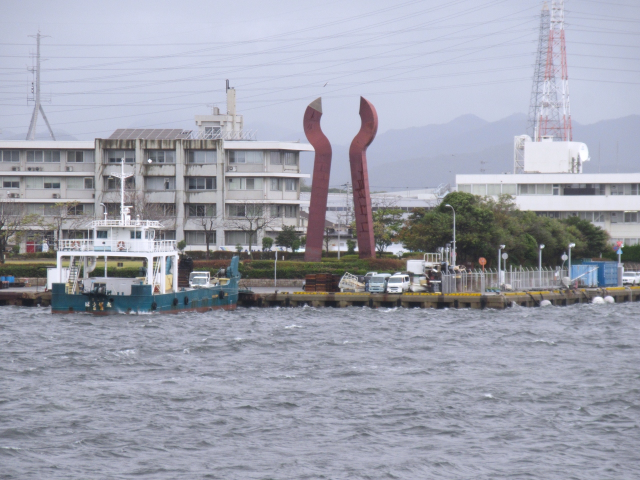 波止場手前の飾万津臨港公園のモニュメント『翔舞』が手を開いて「歓迎」