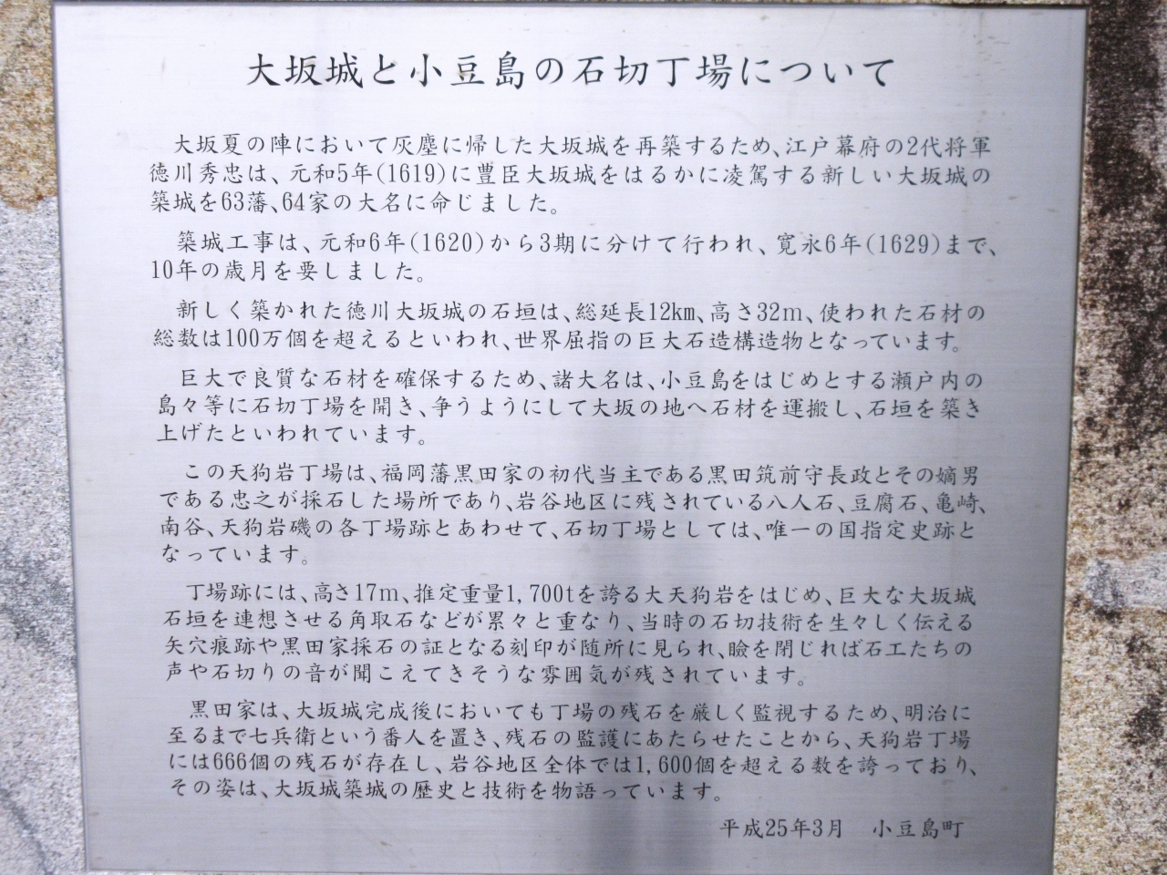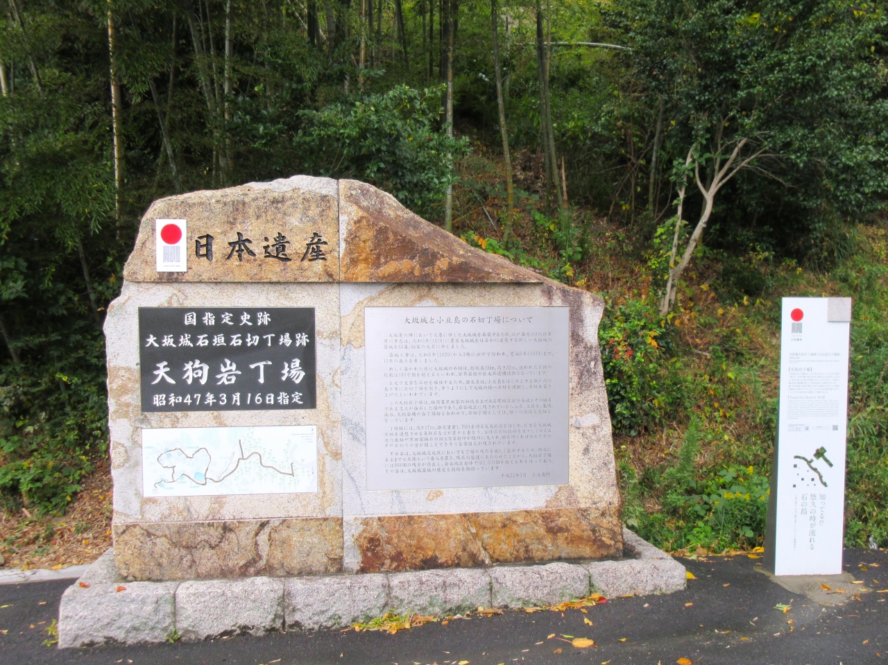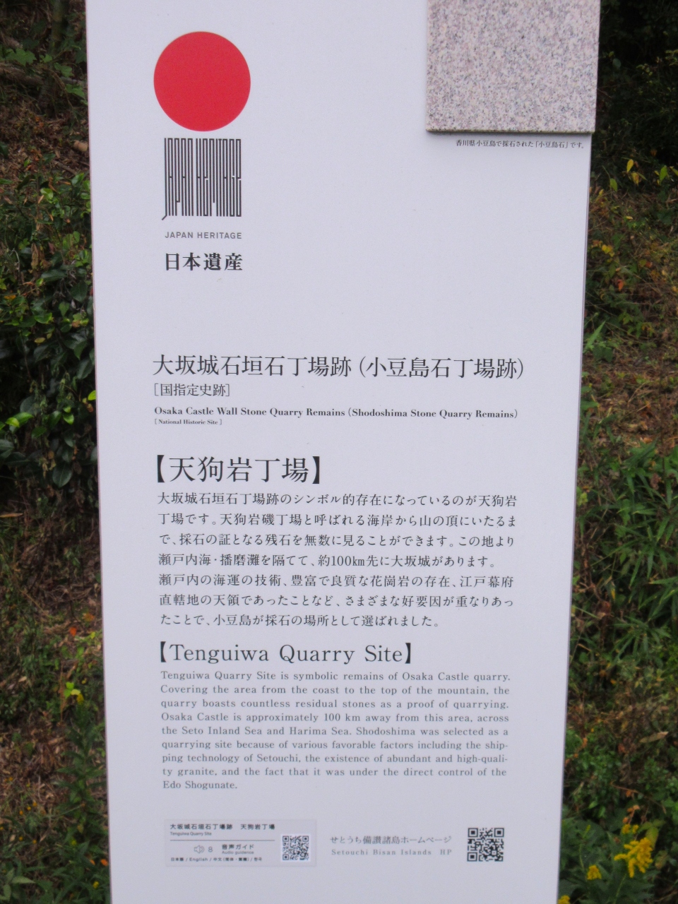 小豆島の東海岸の国道436号線沿いに、「日本遺産 国指定史跡 天狗岩丁場」という石碑が建っています。その解説板に、「大坂城石垣石切丁場跡」についての詳しい説明が書かれていました。小豆島には、大阪城の石垣に使われた、良質の花崗岩があったんですね。