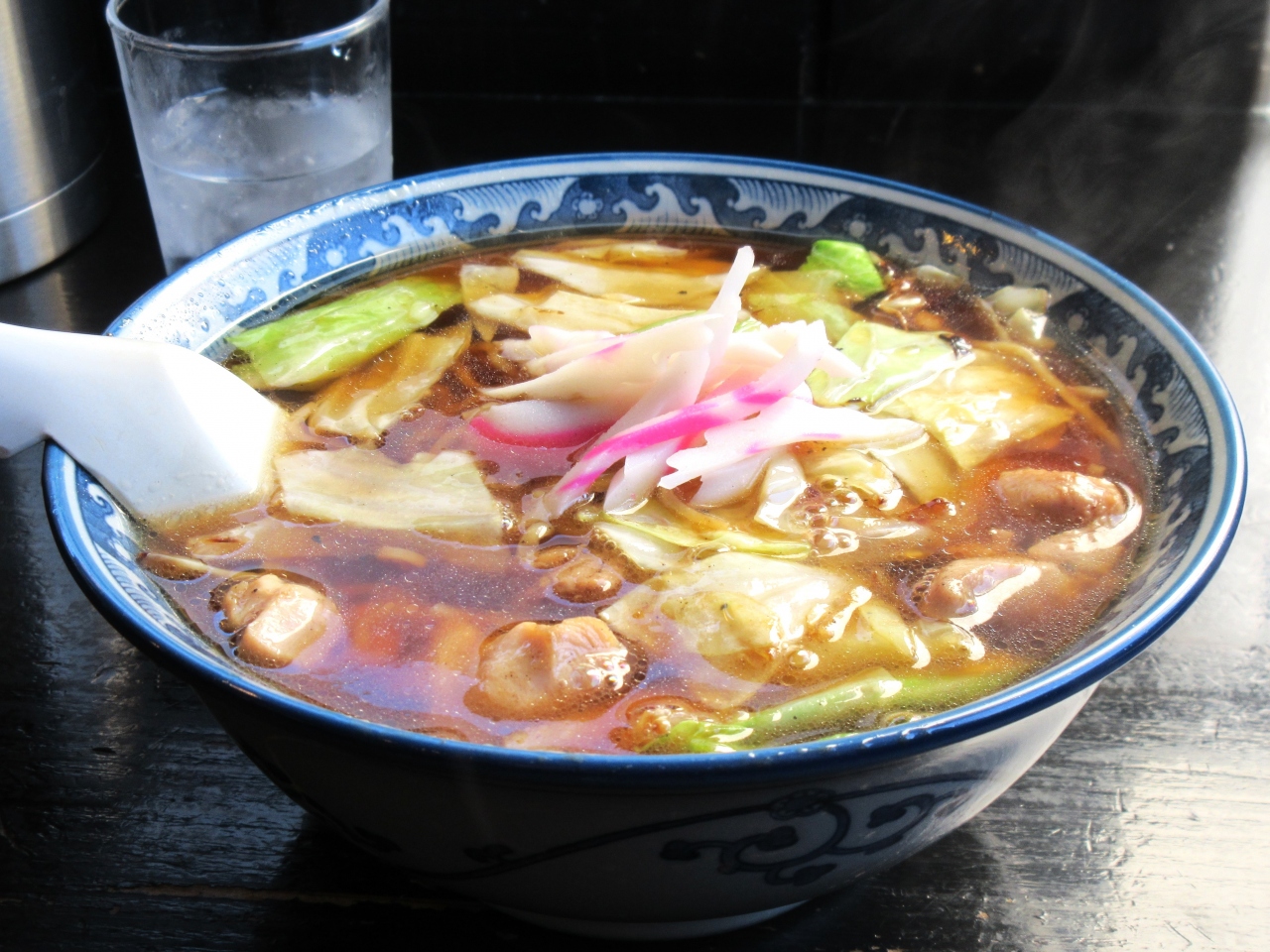 醤油ラーメンのスープに、ウスターソースで味のついた焼きそばが入っています。具は、シャキシャキのキャベツ、千切りのナルト、焼いて味のついた鶏肉です。まるで焼き鳥のような感じですが、これが特徴的で美味しいです。- 旅行時期