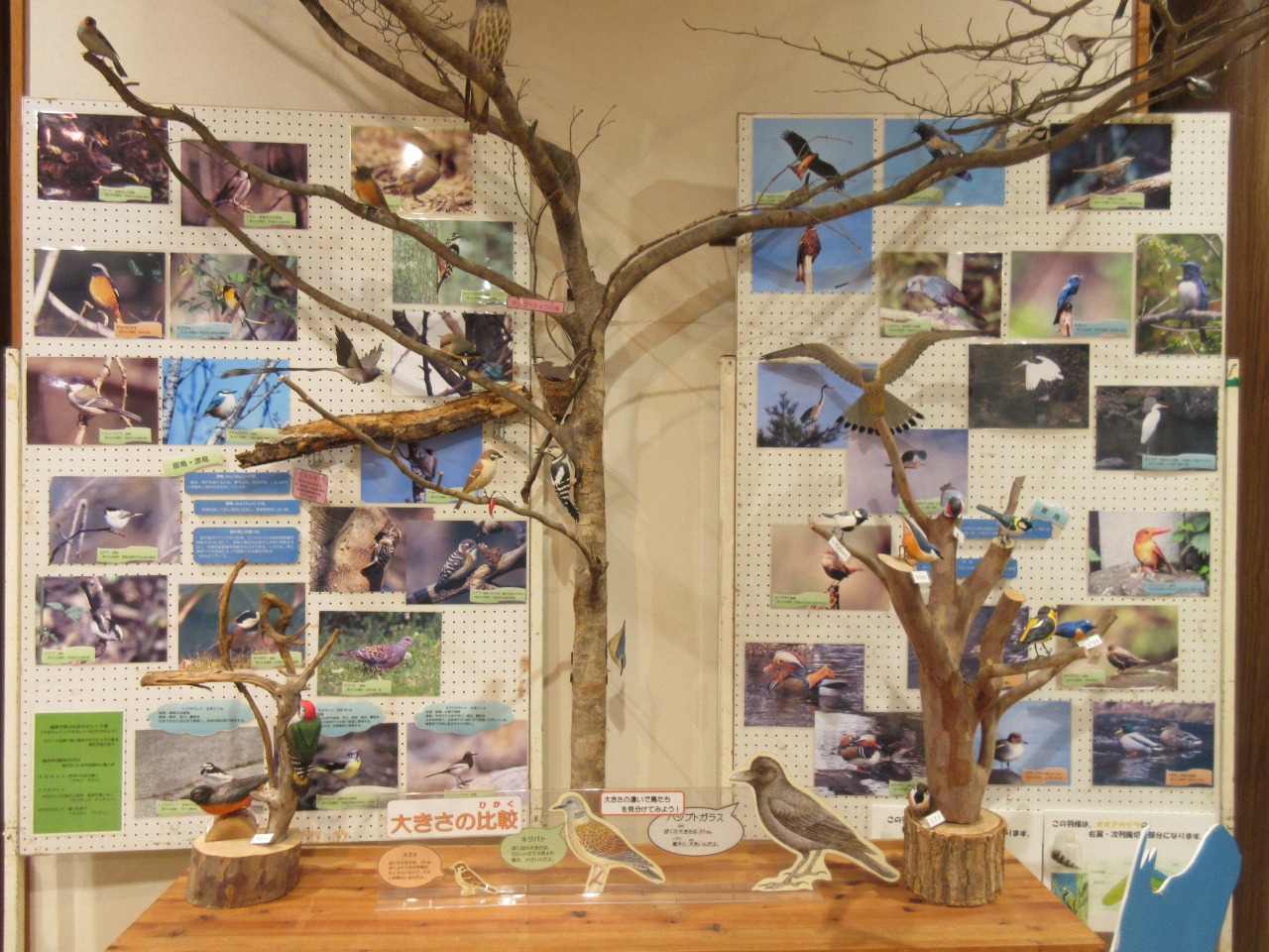 塩原で見られる様々な野鳥たちのはく製は、下のパネルのボタンを押すと、その鳥にランプがついて、さえずりが聞こえます。