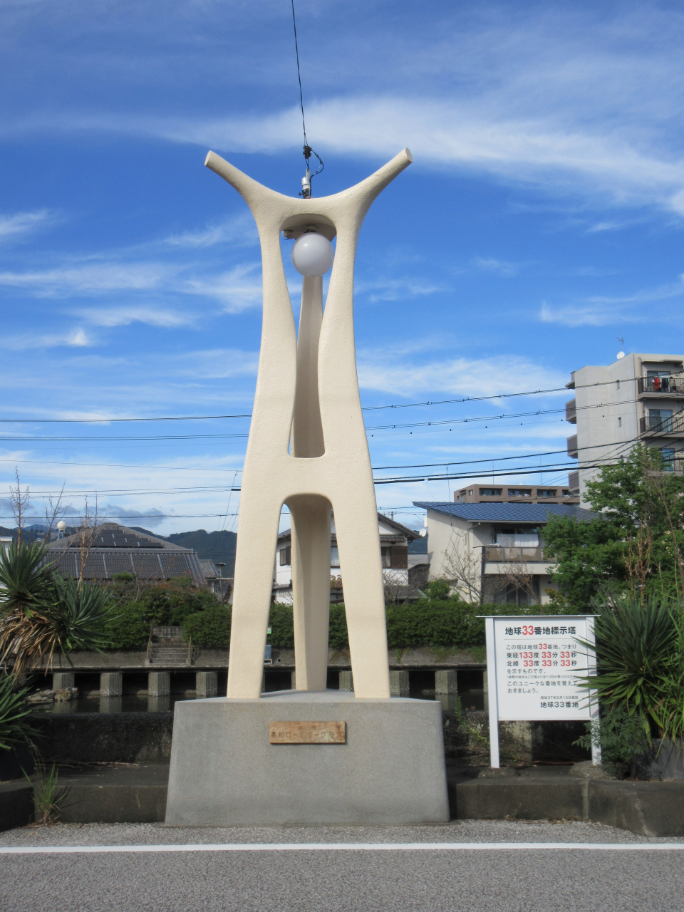 高知市弥生町3に「地球33番地標示塔」がありますが、正確には実際の地点はこの塔より北へ30m寄った江の口川の中だそうです。そこには桟橋の先に地球儀のような球体のものが乗っています。