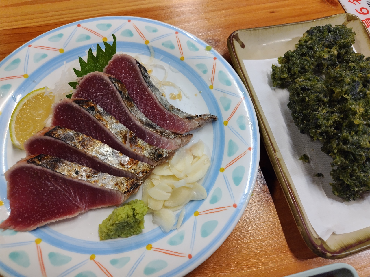やはりやいろ亭と言えば「かつお塩たたき」、そして好きなのが「あおさ天」をオーダーします。
