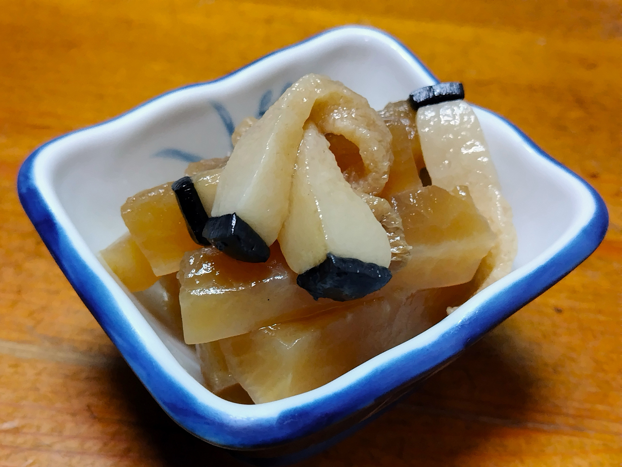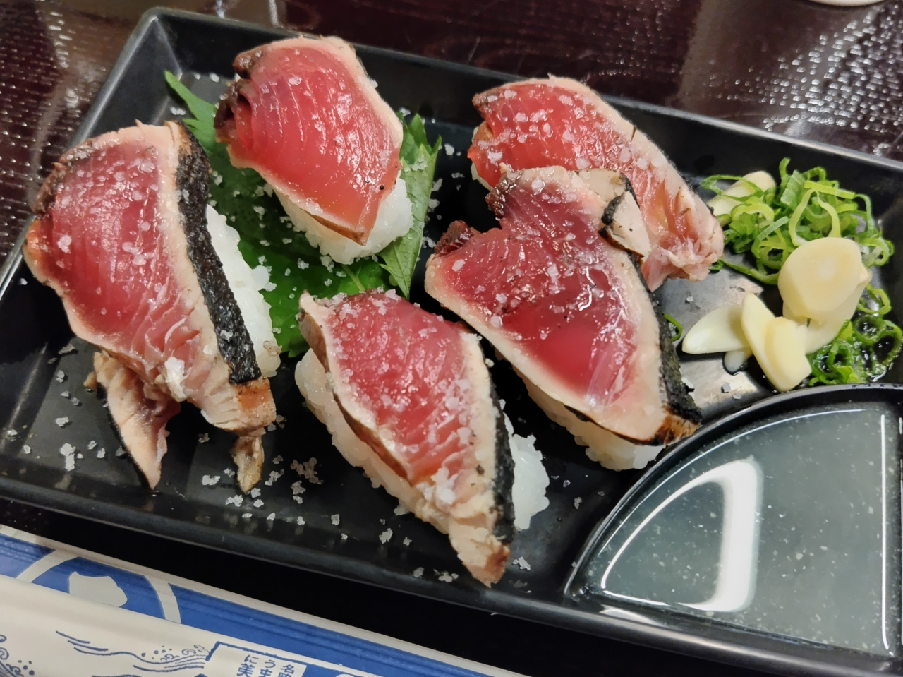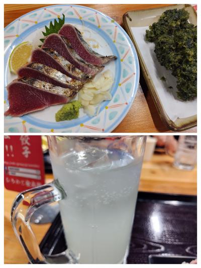 高知ならではのものをと、はらんぼ(生かつおのトロ部分)のたたきと、くじら大根もいただきました。