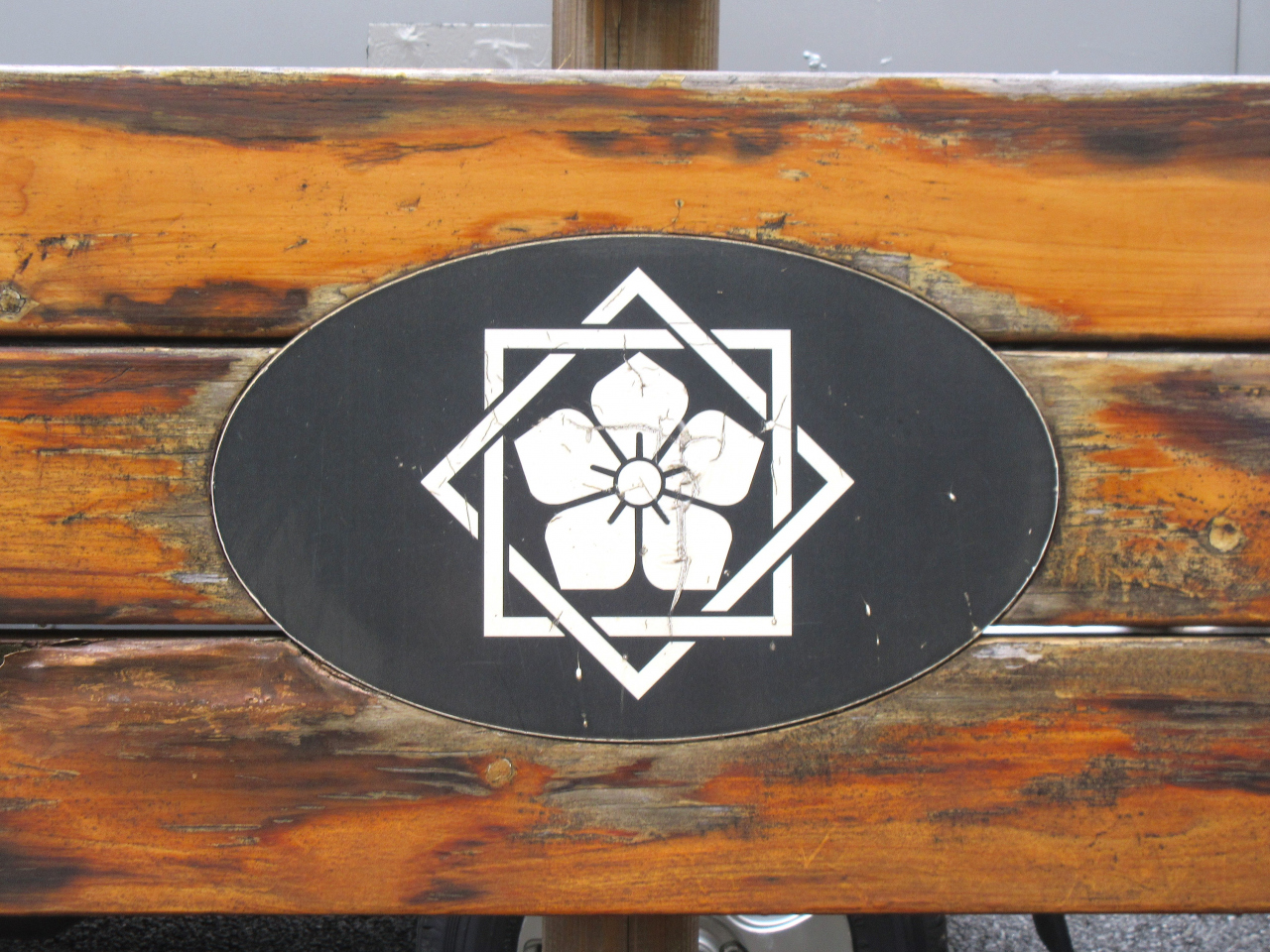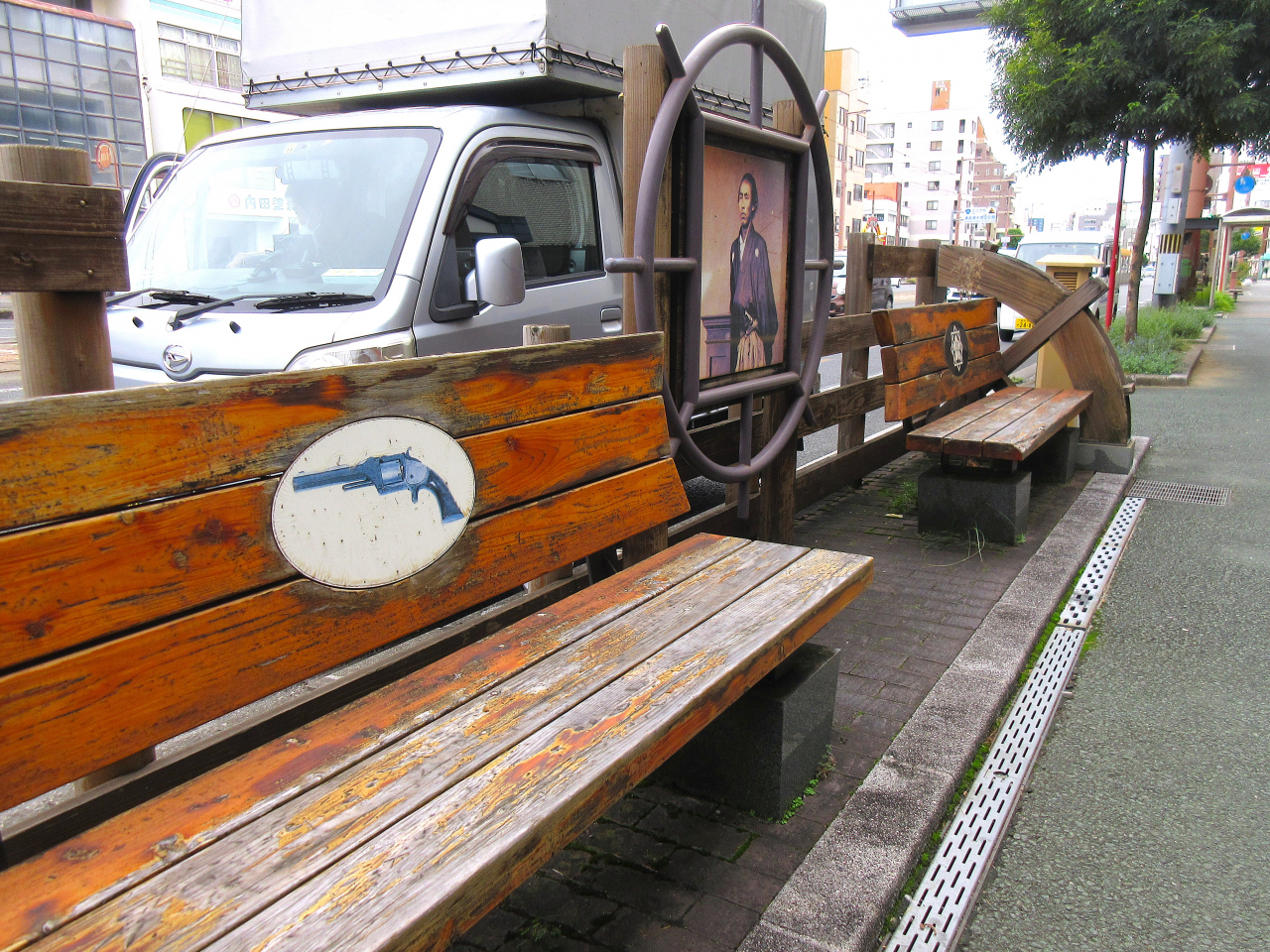 石碑前のベンチには、坂本龍馬、ピストル、家紋も飾られていて、フォトスポットになっています。