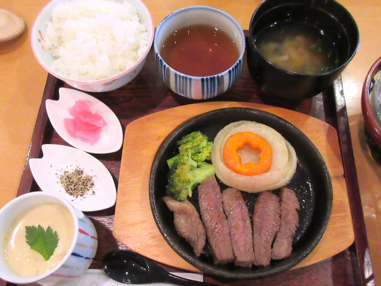一の膳は、牛ステーキ(和風)、茶わん蒸し、味噌汁、香物、ごはん。