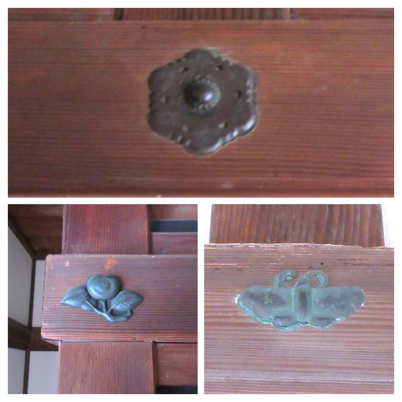 長押についている、六葉、果実、昆虫のデザインの釘隠し金具がとても面白いです。- 旅行時期