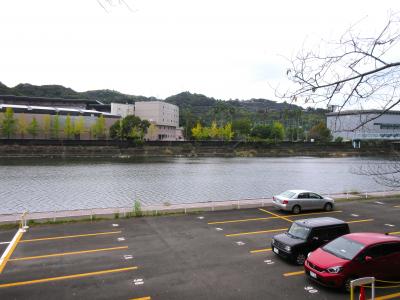 鏡川の対岸からのアングルで、鏡川、高知市街、山内神社の森が描かれています。