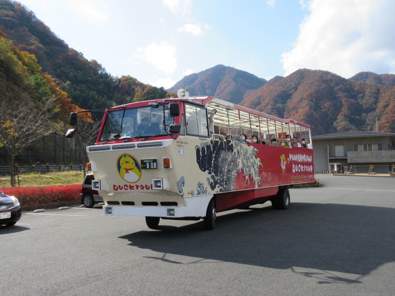 湯西川ダム見学と、水陸両用車による湯西川湖へのスプラッシュイン(ザブン!!と入水)とクルーズを含めて、所要時間が約90分。