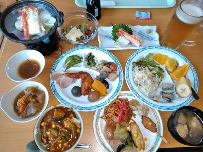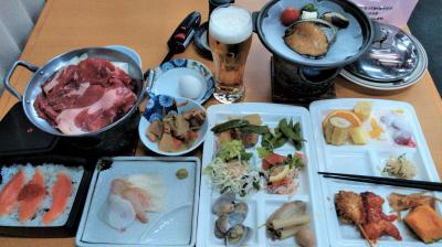 ハーフバイキングの夕食は、メイン料理が事前にテーブルに用意されていました。牛すき焼き、うな重までありました。さらに通常の20種以上のバイキング料理があって、手羽先や合鴨のスモークなど、大好きな料理が揃っていました。アルコール1杯も無料でした。