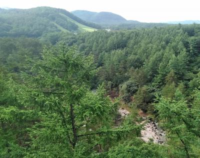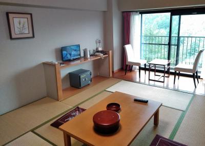 部屋からの眺望が良くて、草津、白根から遠くの山々まで見晴らせます。窓の下は西の河原で、森に包まれています。