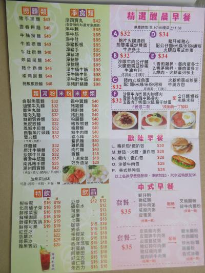 「香港仔魚蛋粉」という店名から推測できるように、魚のすり身団子(つくね)入りのスープや麺料理を中心に、炒め物、おかゆと何でもある、とても庶民的なお店です。- 旅行時期