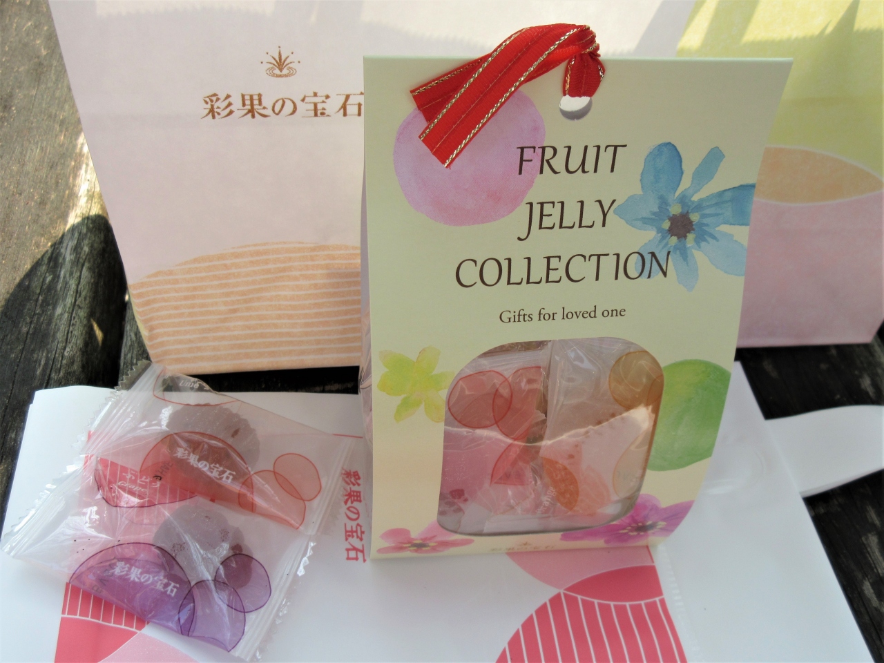 15種類のフルーツゼリーが、一つずつ入っています。その中には、りんご、マスカット、あんず、ラズベリー、グレープフルーツ、青梅、赤梅、プルーンといったものも含まれています。