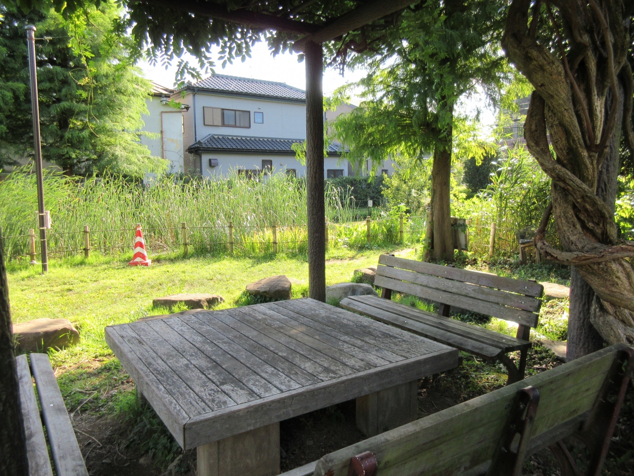 ぐるりと回ると、小さな藤棚があって、その下にテーブルと椅子がありました。唯一気分的にホットできたポイントでした。