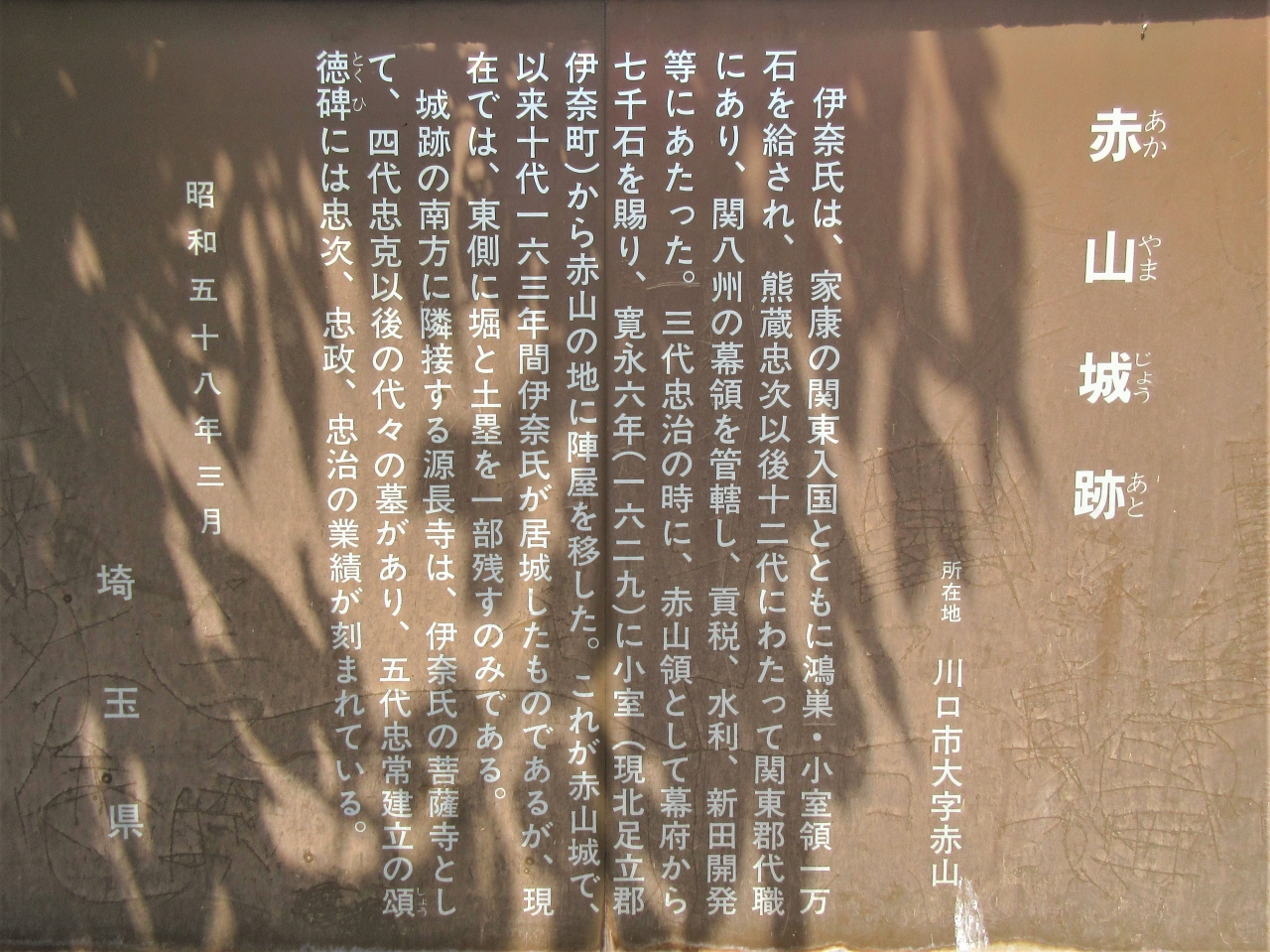 1629年から163年間、伊奈氏による治水事業や新田開発の拠点だった赤山城があった場所です。伊奈氏の、江戸幕府の基礎財政に対する多大な貢献の度合いは、単なる田舎城のレベルではなく、幕府の国家プロジェクトともいえるものだった。